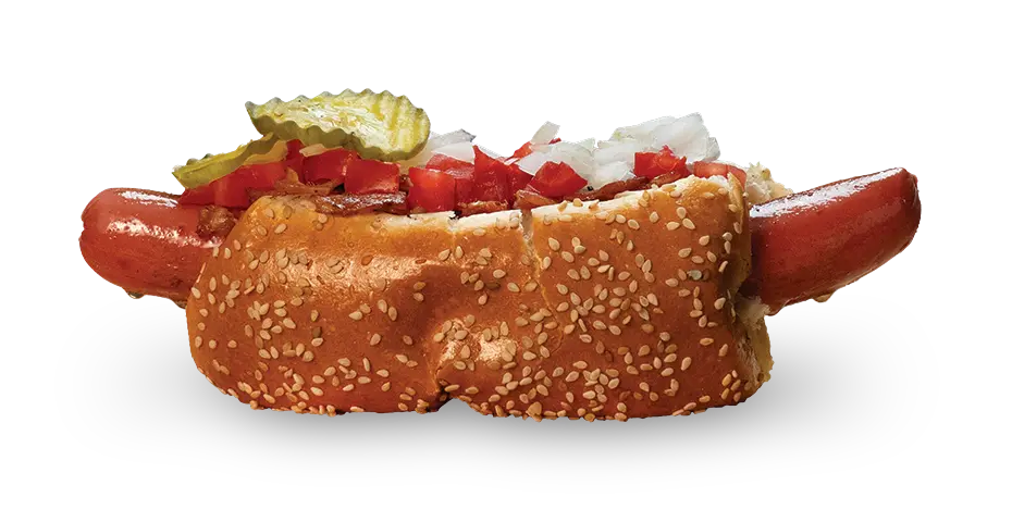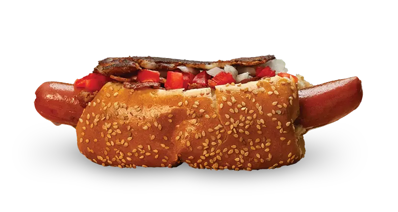 Pan artesanal con ajonjolí, salchicha jumbo, tocino premium, vegetales frescos y aderezos.