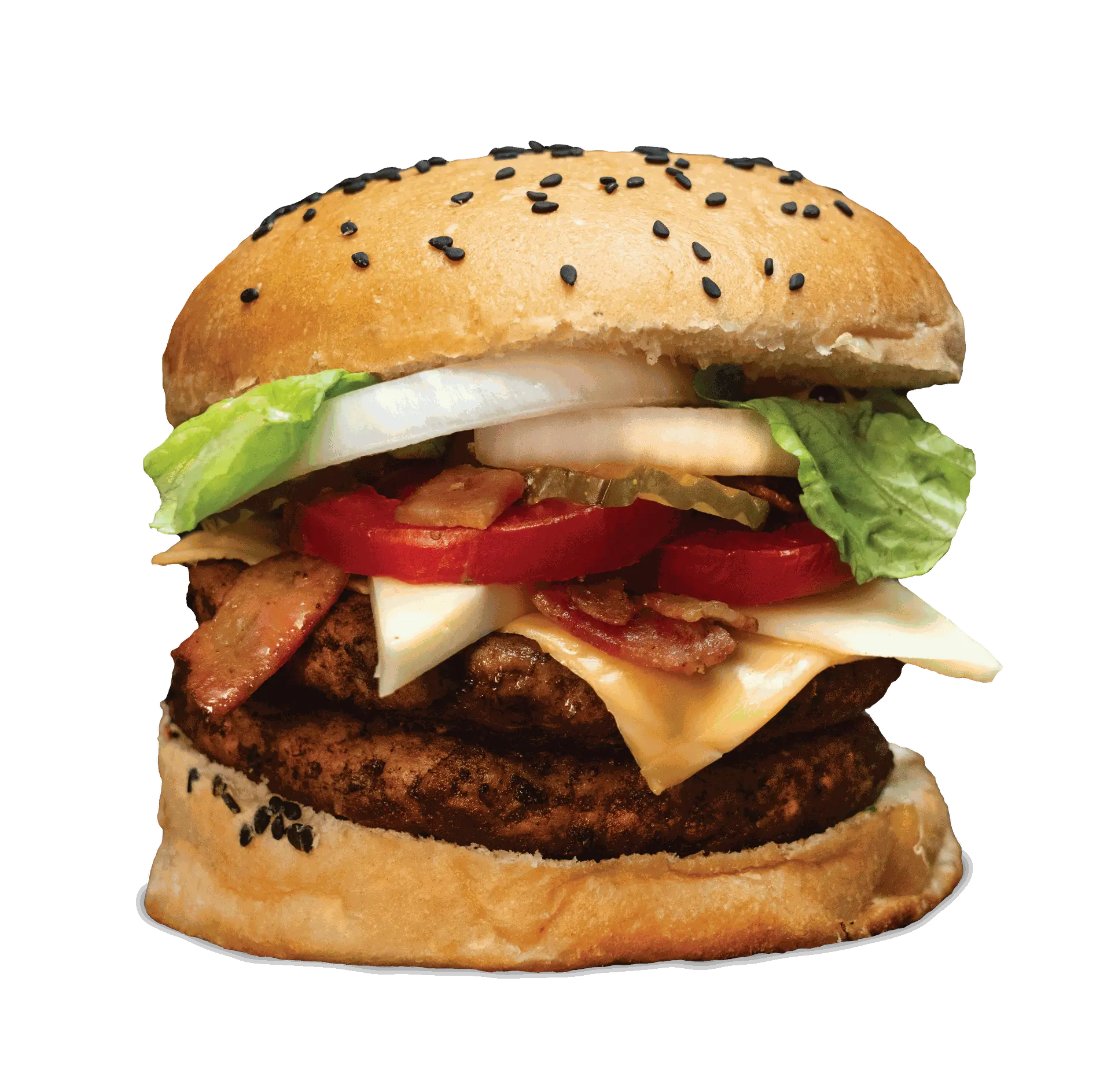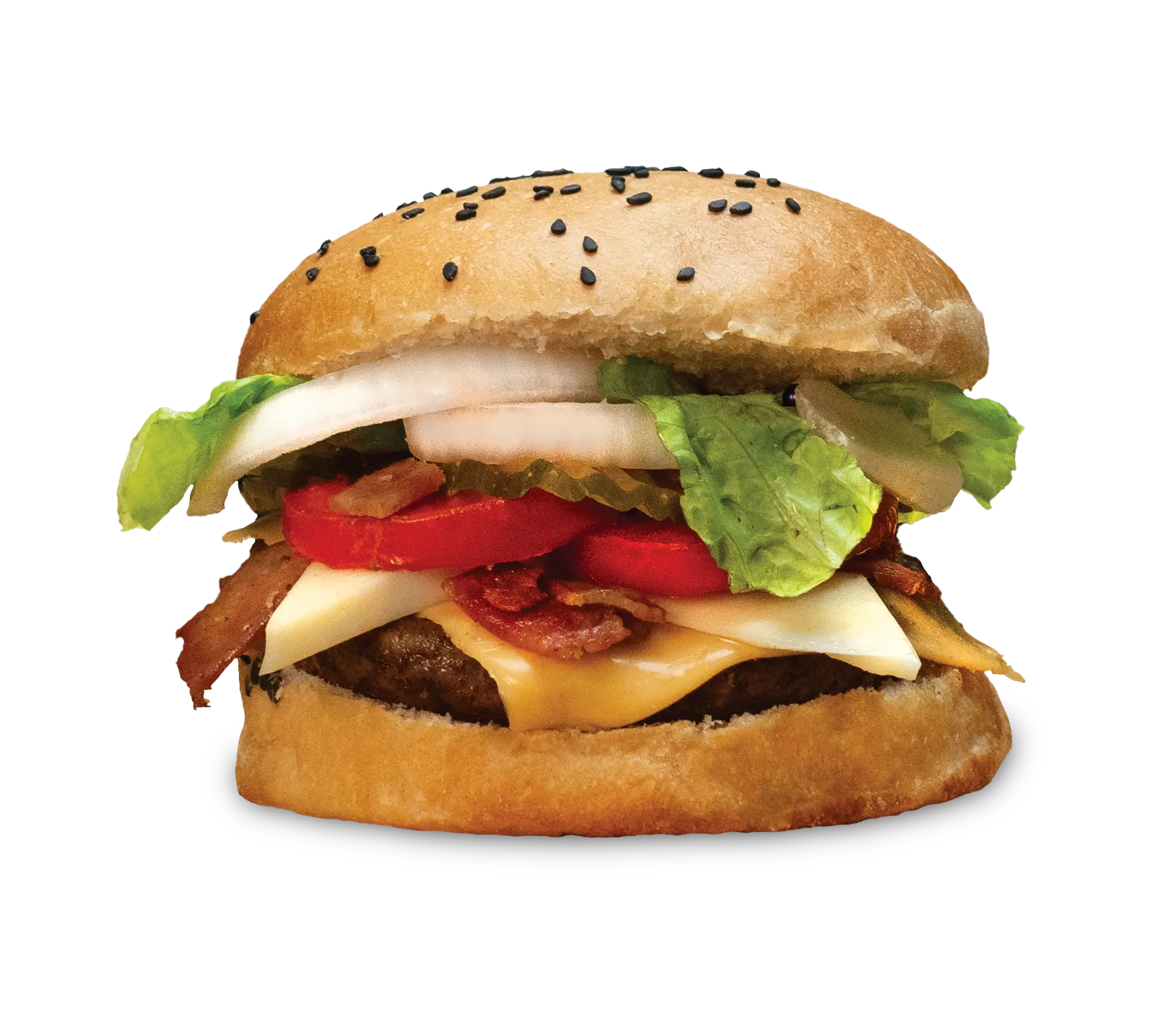 Pan con ajonjolí, queso amarillo, tocino, carne 100 % de res, vegetales frescos y aderezo de la casa.