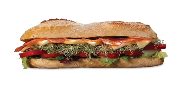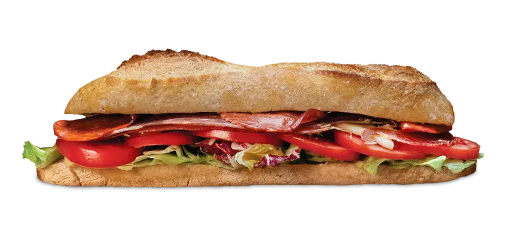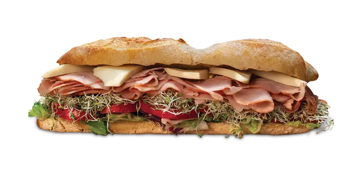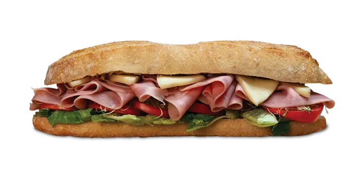 Baguette de masa madre con lomo canadiense, queso Chihuahua y vegetales frescos.