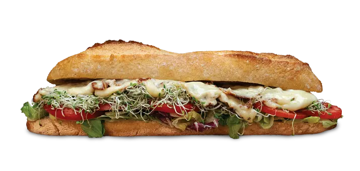 Baguette de masa madre con mezcla de quesos: Chihuahua, mozzarella, cheddar y vegetales frescos.