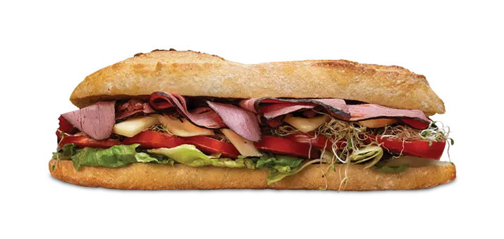de masa madre con roast beef, queso cheddar y vegetales frescos.